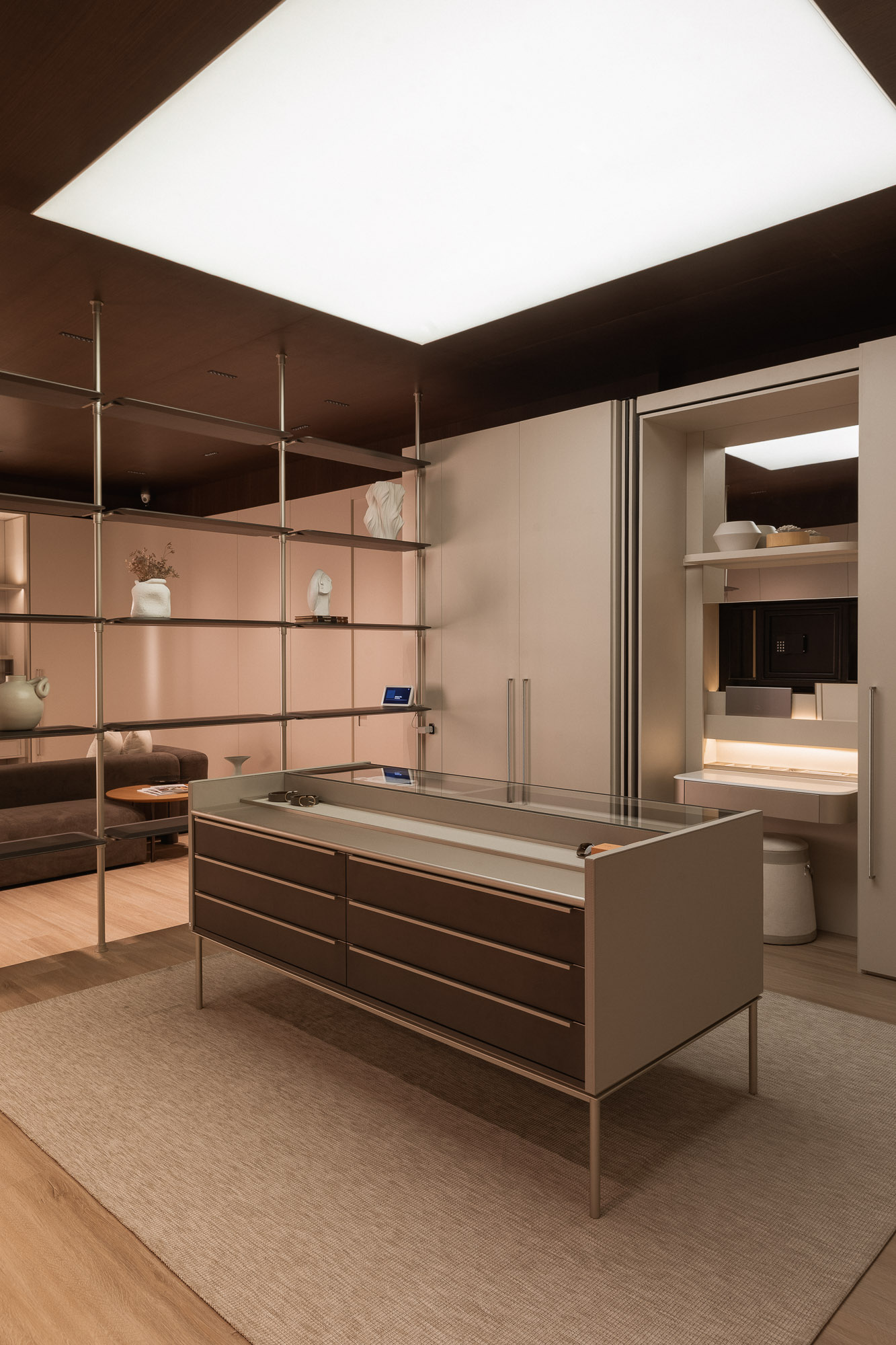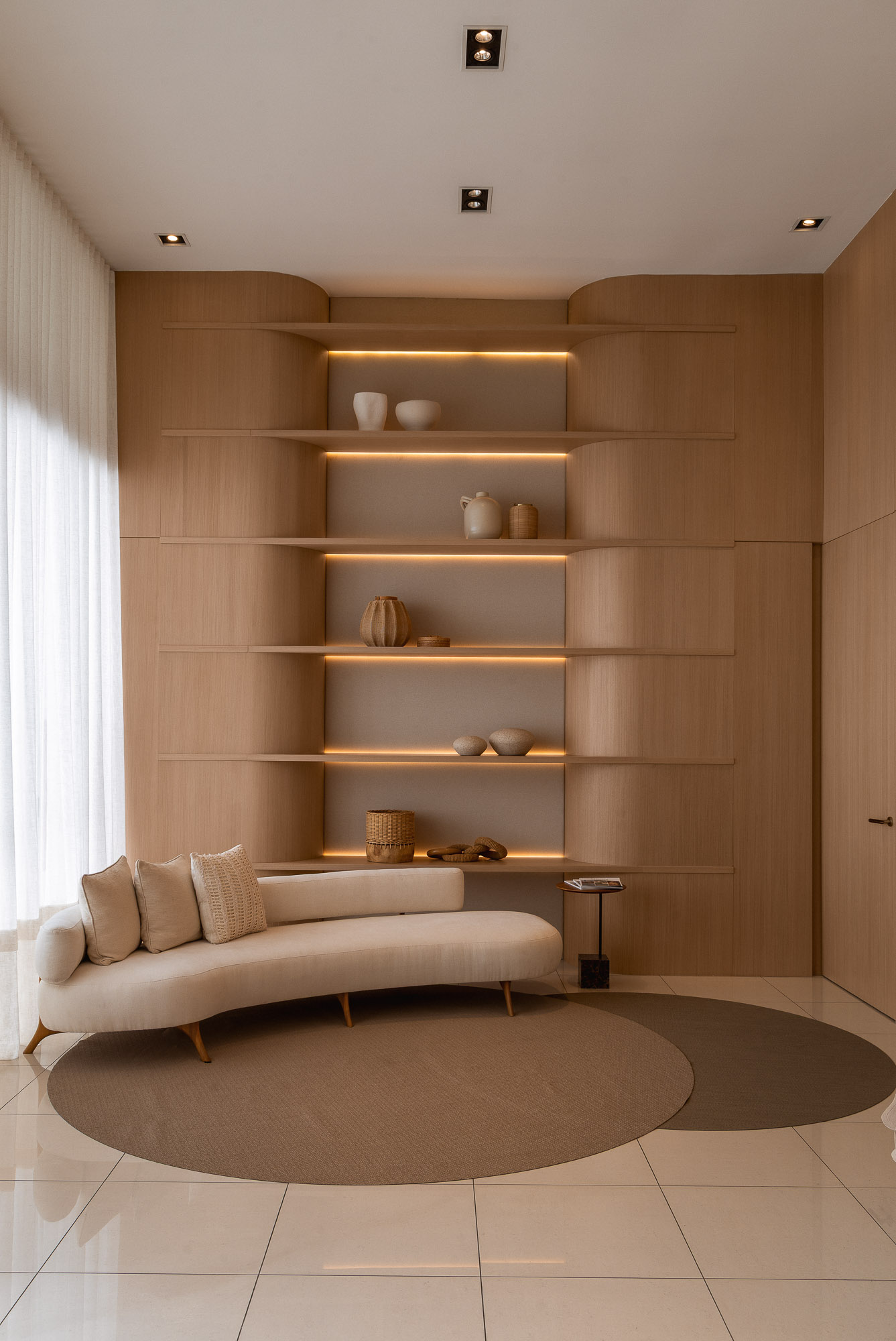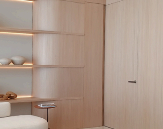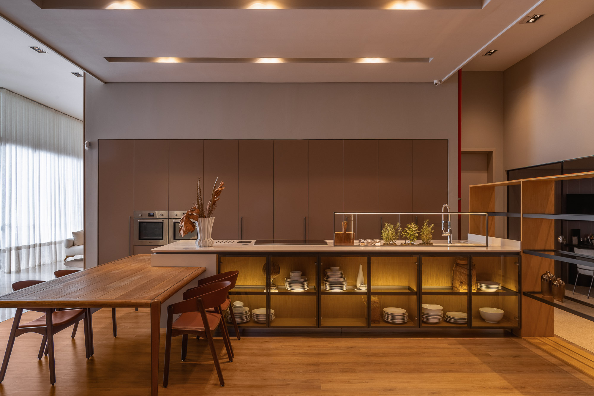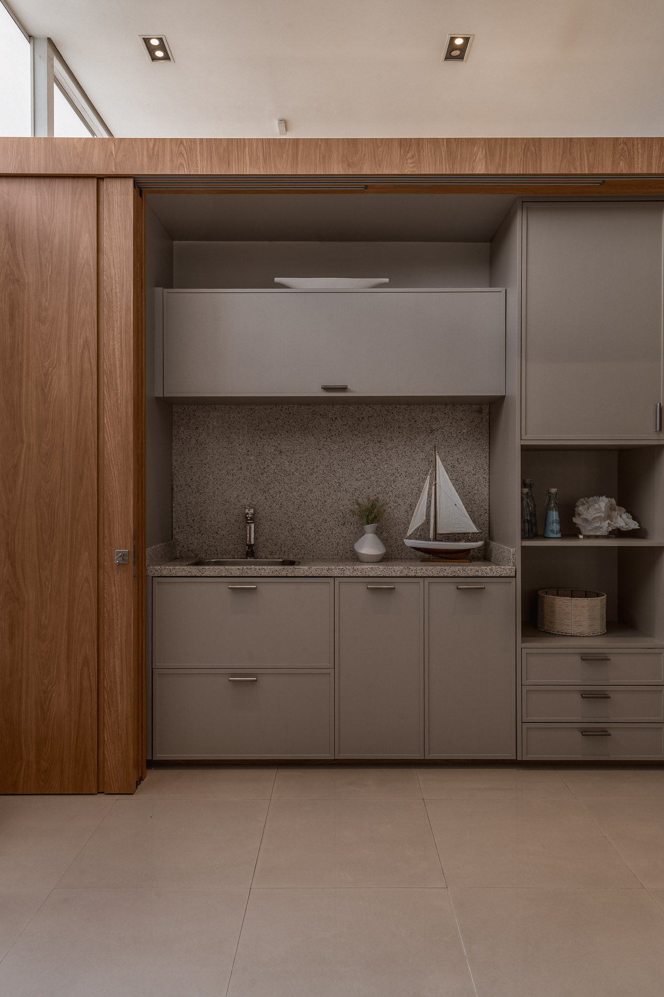The coplanar door provides visual and functional fluidity, connecting spaces with lightness.