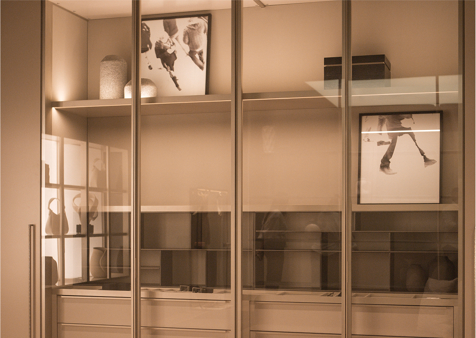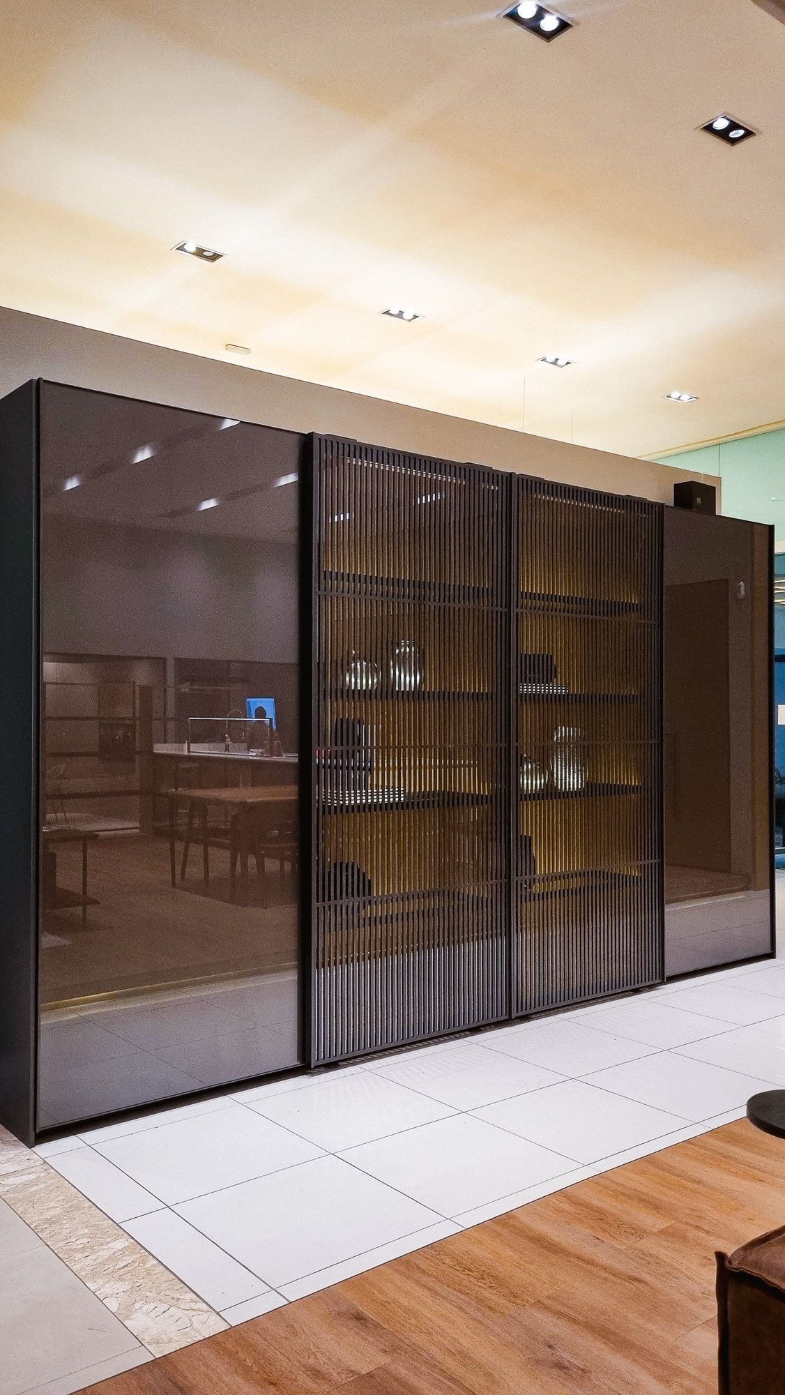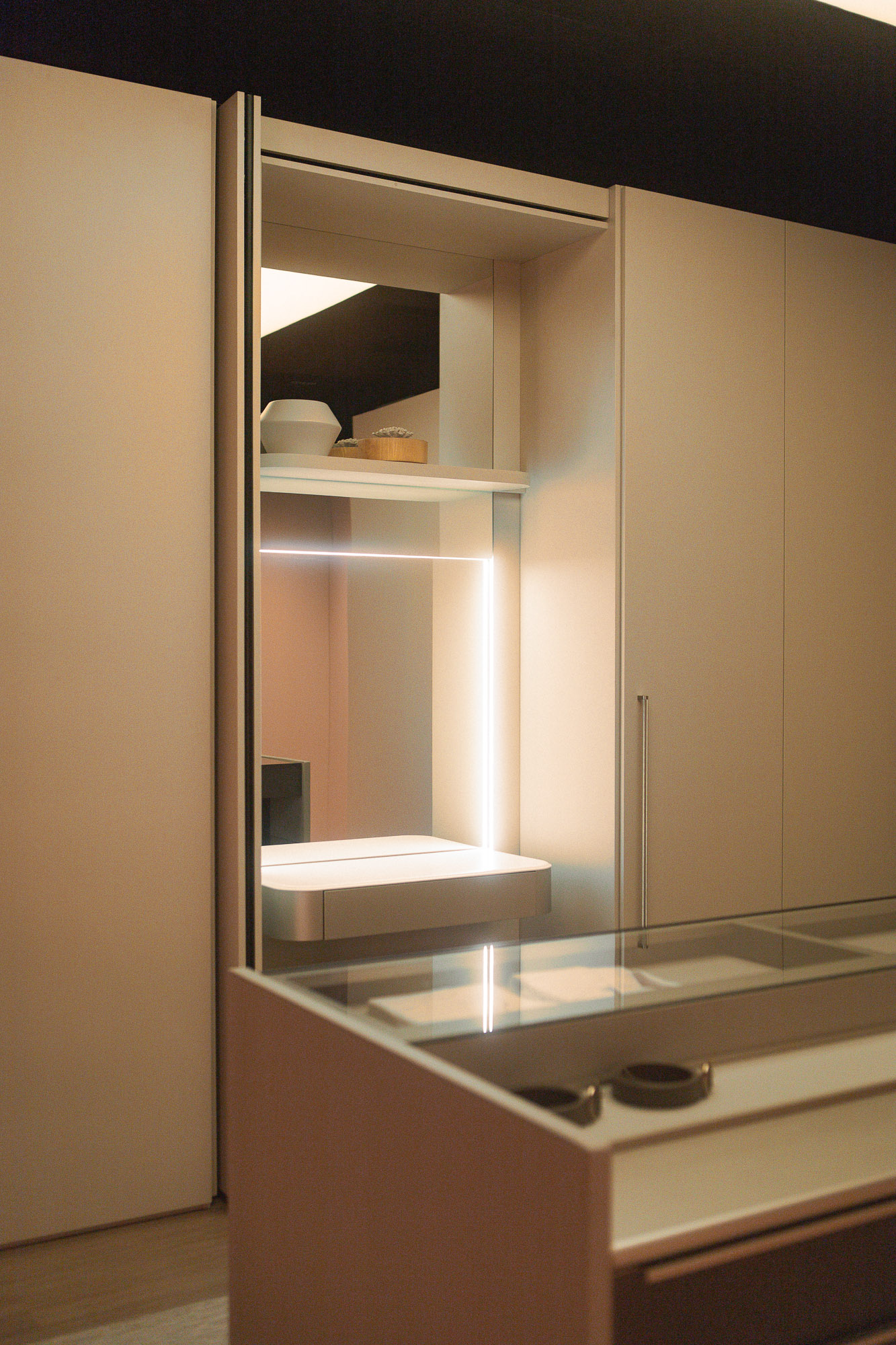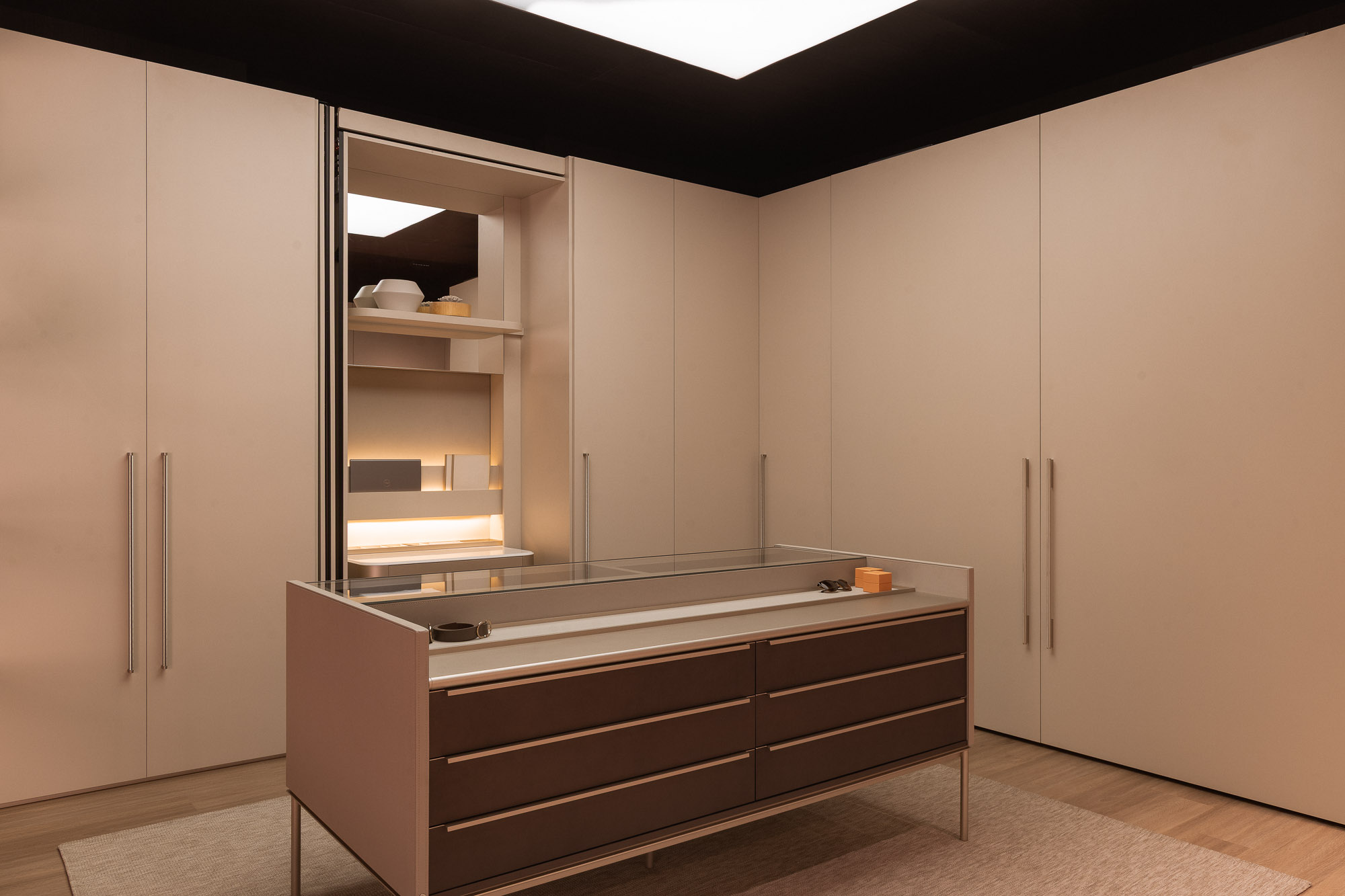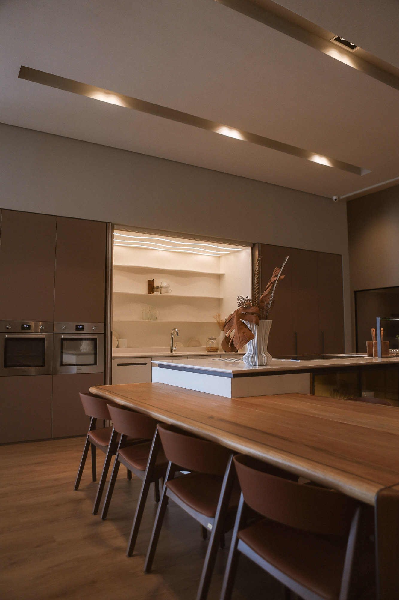 The coplanar door provides visual and functional fluidity, connecting spaces with lightness.