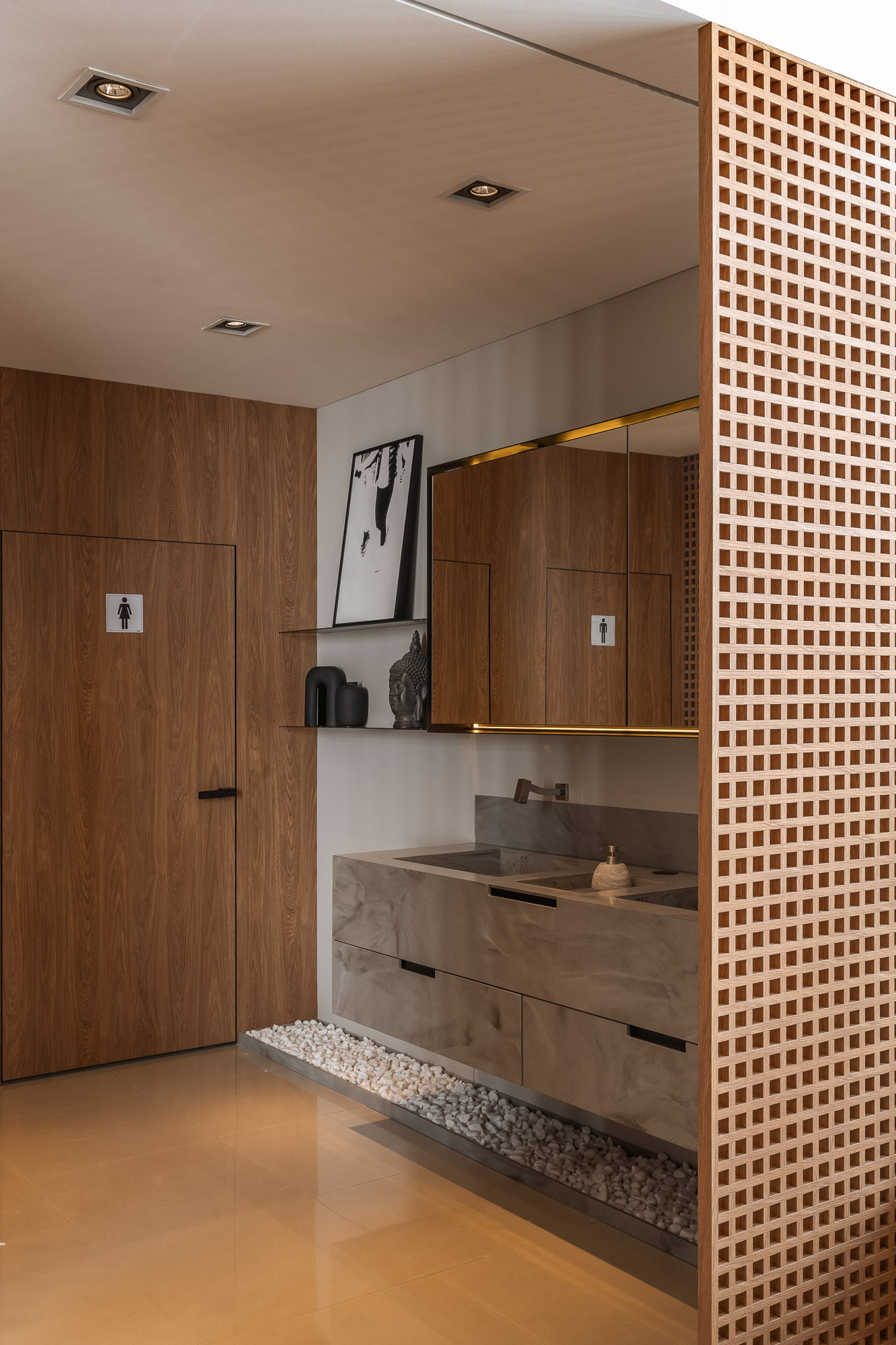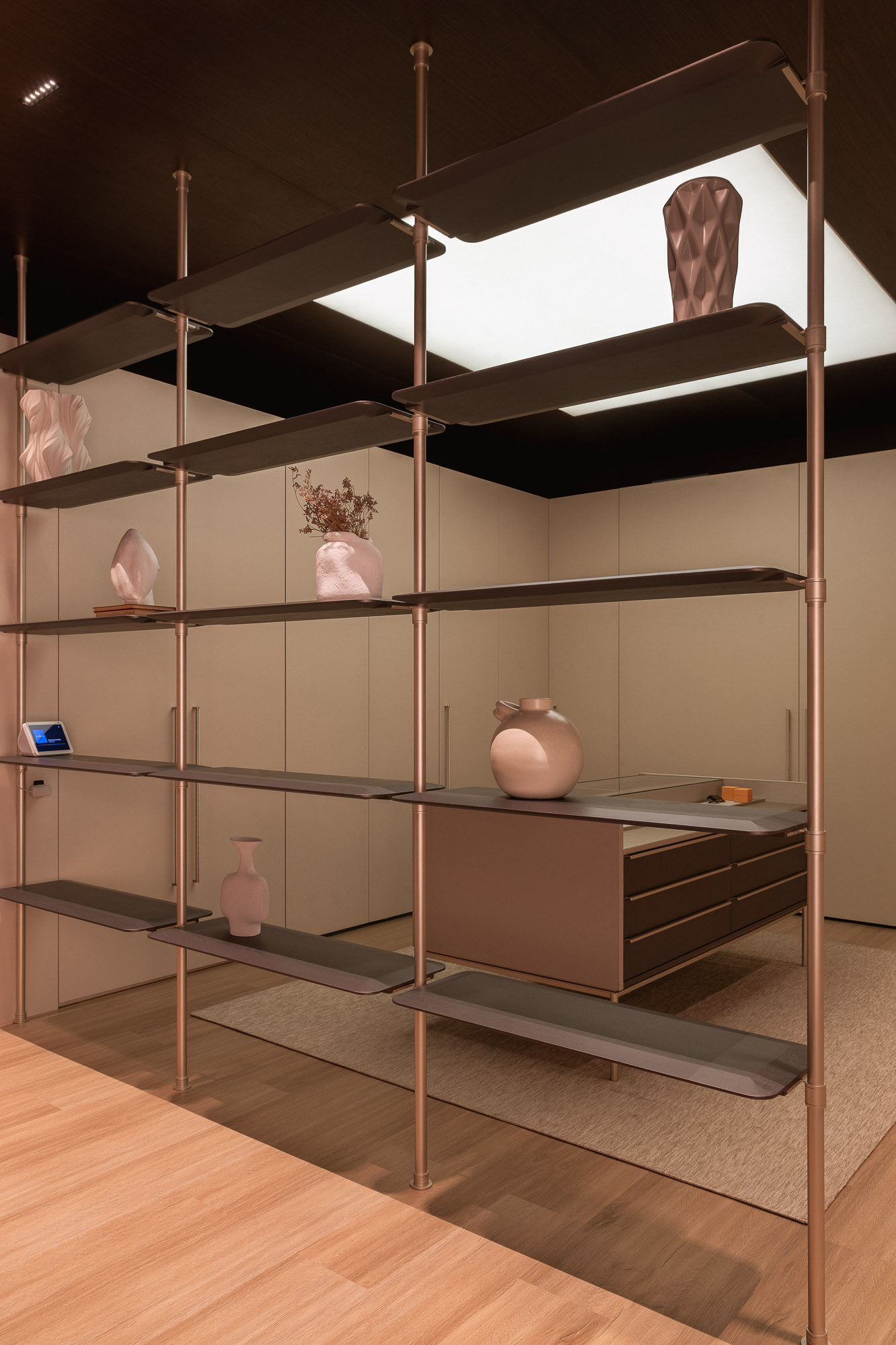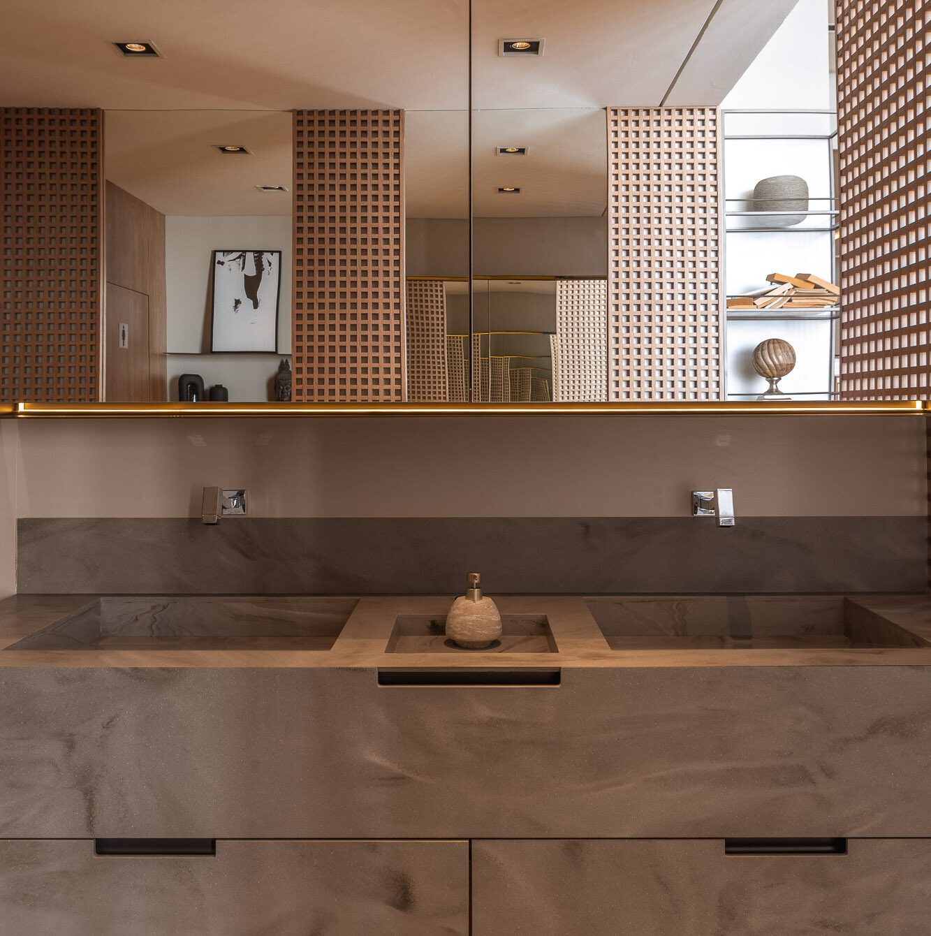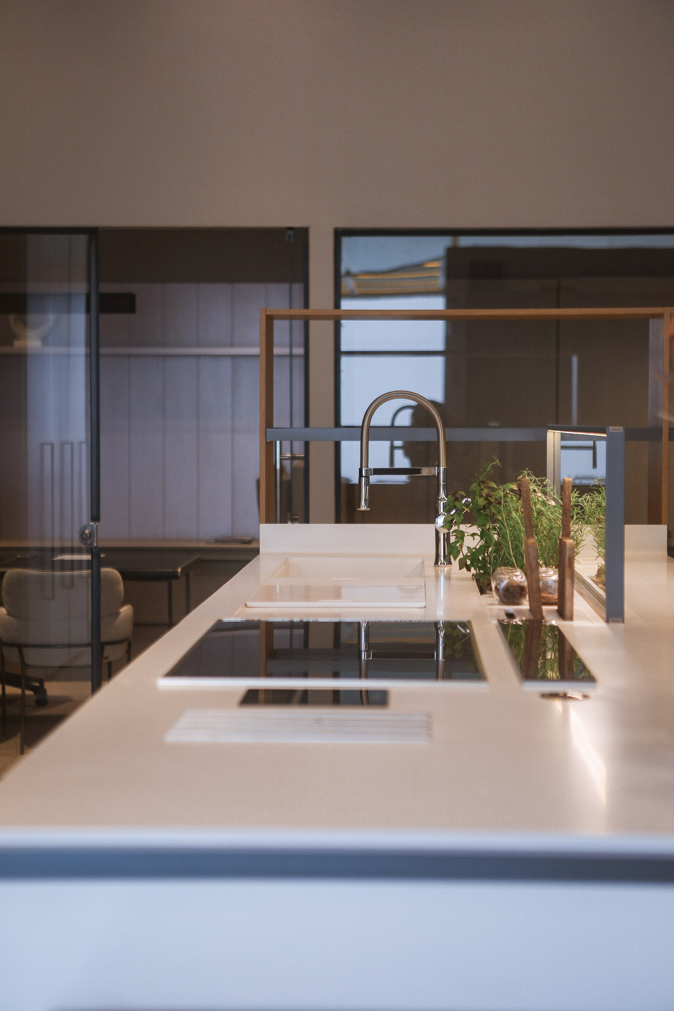 The coplanar door provides visual and functional fluidity, connecting spaces with lightness.