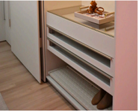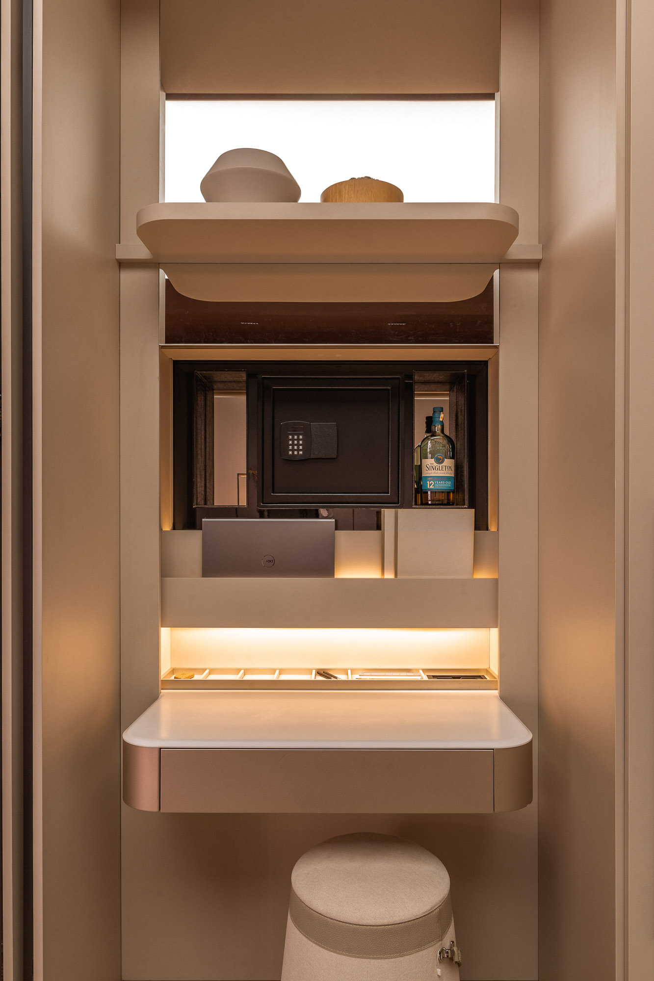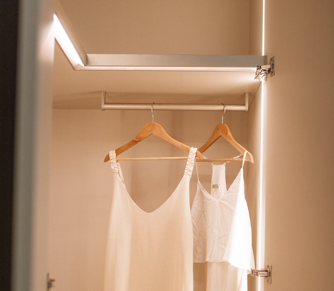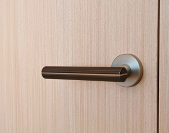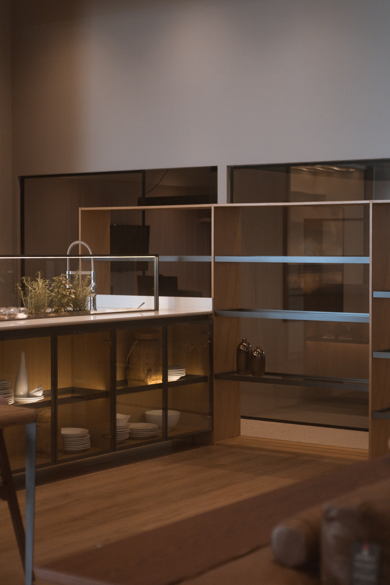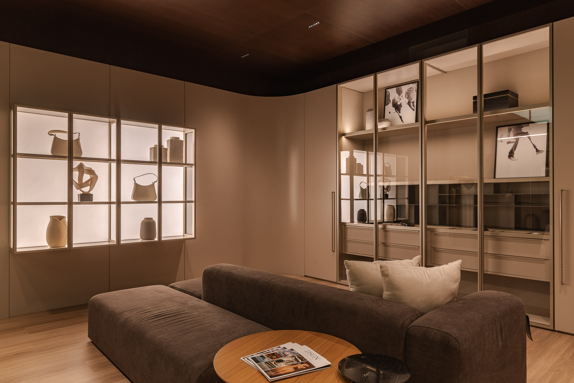 The coplanar door provides visual and functional fluidity, connecting spaces with lightness.