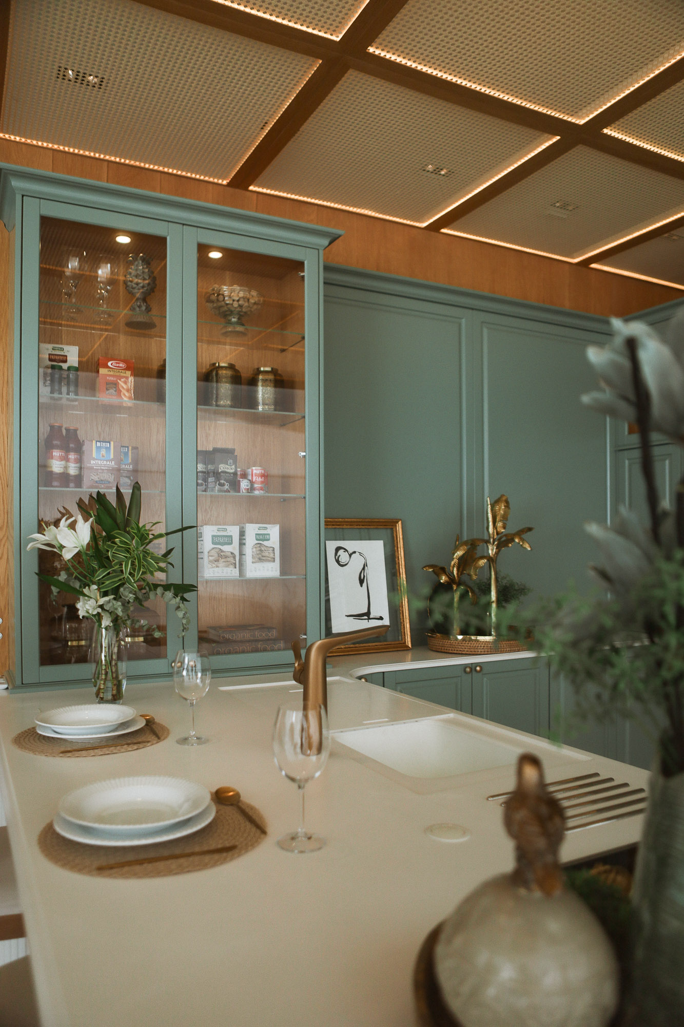 The dark ceiling adds depth and elegance, bringing balance to the composition.
