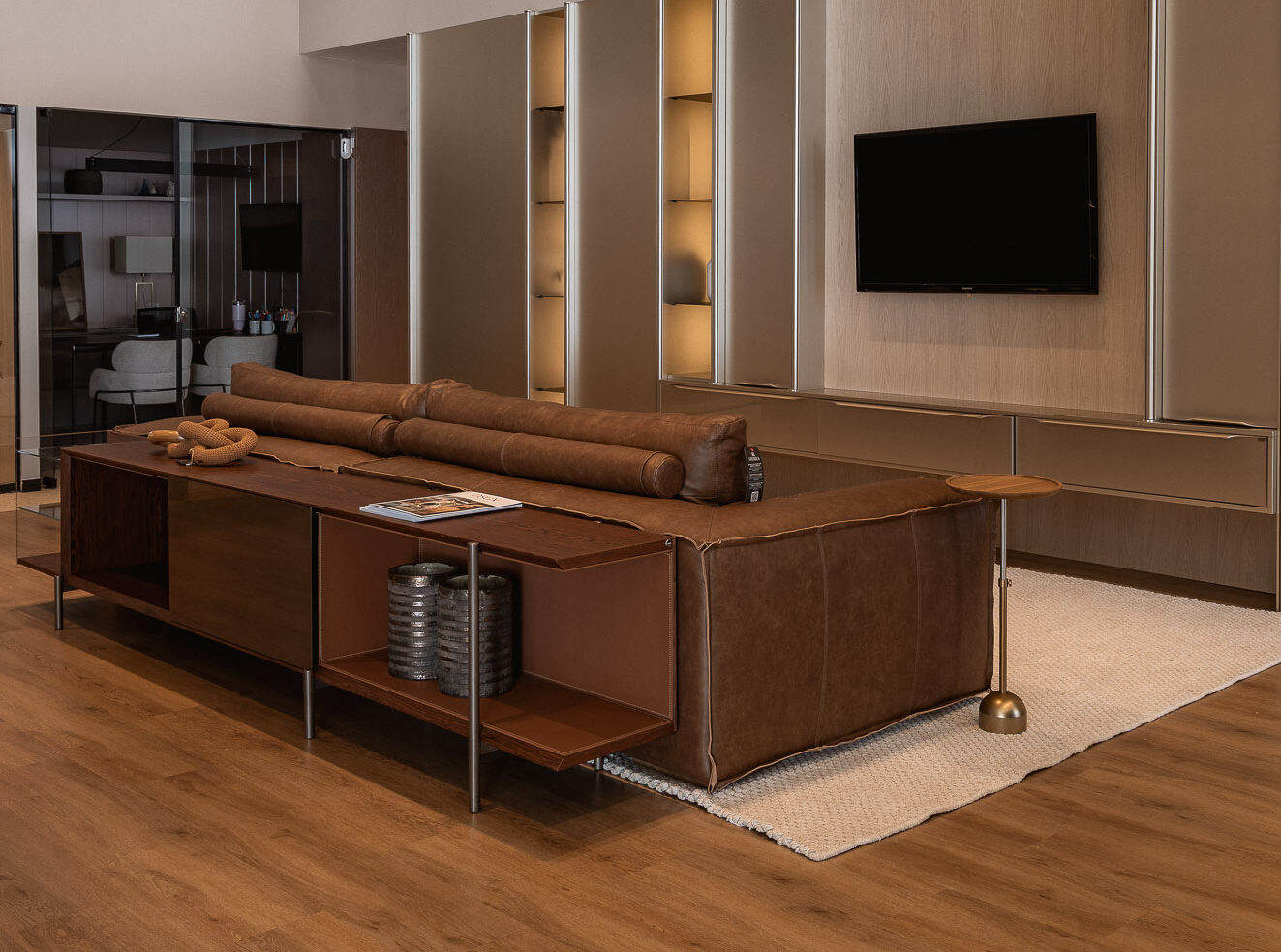 The combination of contemporary neutrals and the soft touch of leather creates a warm, timeless, and sophisticated palette.
